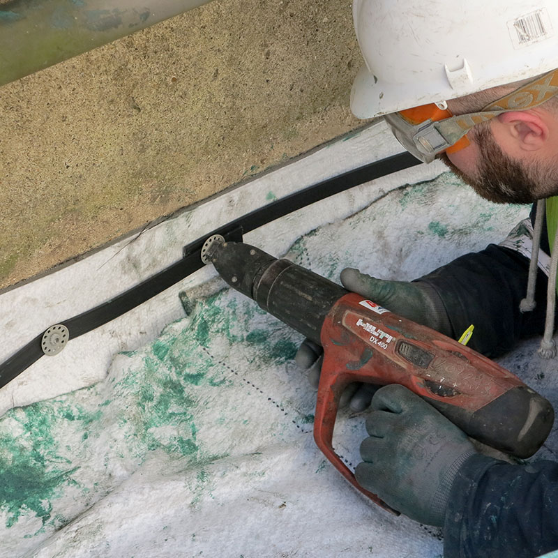 A HDPE bar designed to hold RAWMAT® HDB membranes securely in place in vertical applications, it is secured by firing RAWMAT® fixings through the termination bar and the membrane into the concrete.